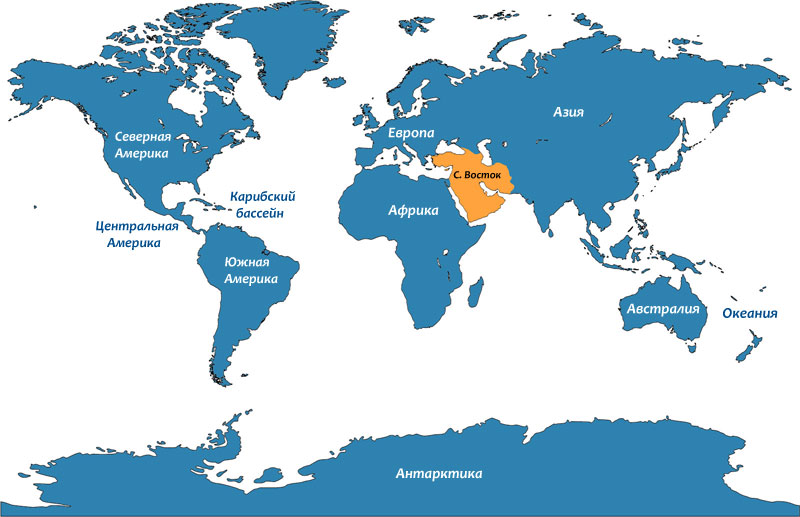Современный Ближний и Средний Восток располагается там, где встречаются Африка, Азия, и Европа. Все страны Ближнего и Среднего Востока являются частью Азии, однако для ясности и наглядности они были вынесены в отдельный географический регион. |